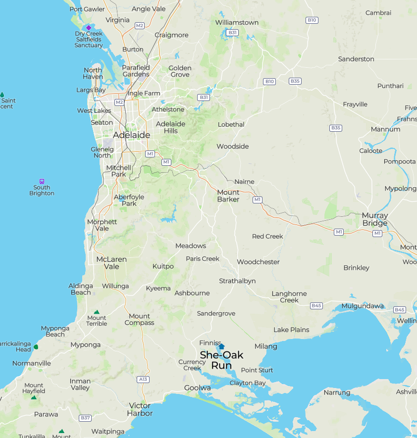 She-Oak Campsite is located at Finniss, approximately 80km (or 1 hour 10 minute drive) south of Adelaide, situated near the Finniss river with direct access for water activities.